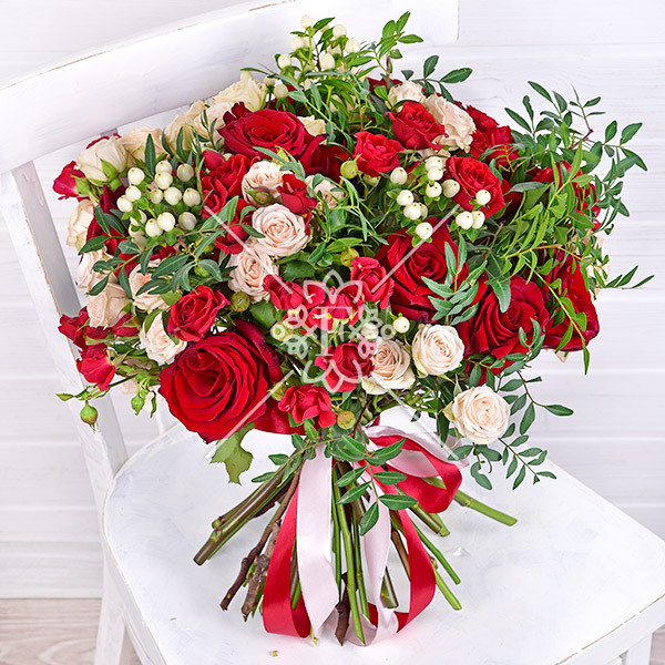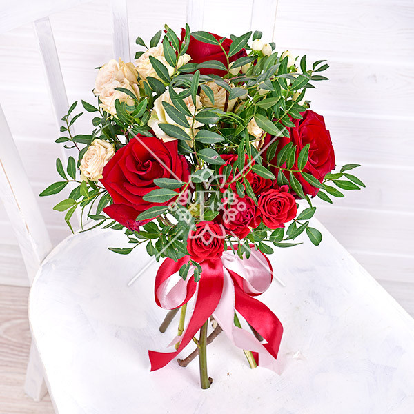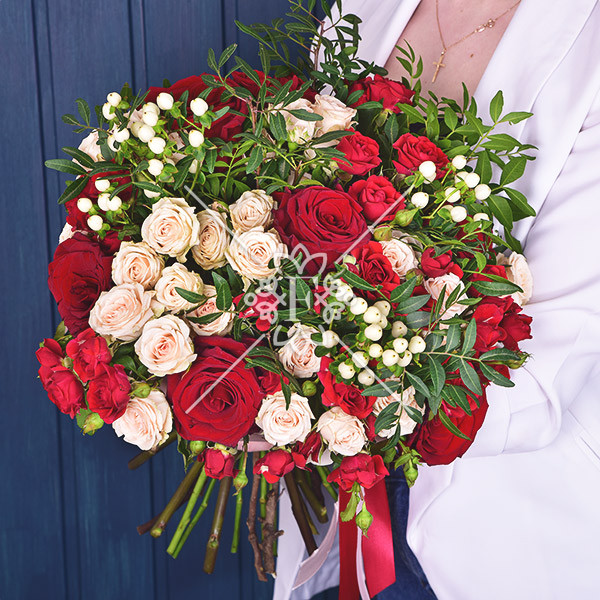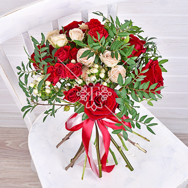 роза красная –  3 шт., роза кремовая (белая) кустовая –  1  шт., роза красная кустовая – 1  шт., гиперикум белый – 1 шт., зелень декоративная (фисташка), лента.